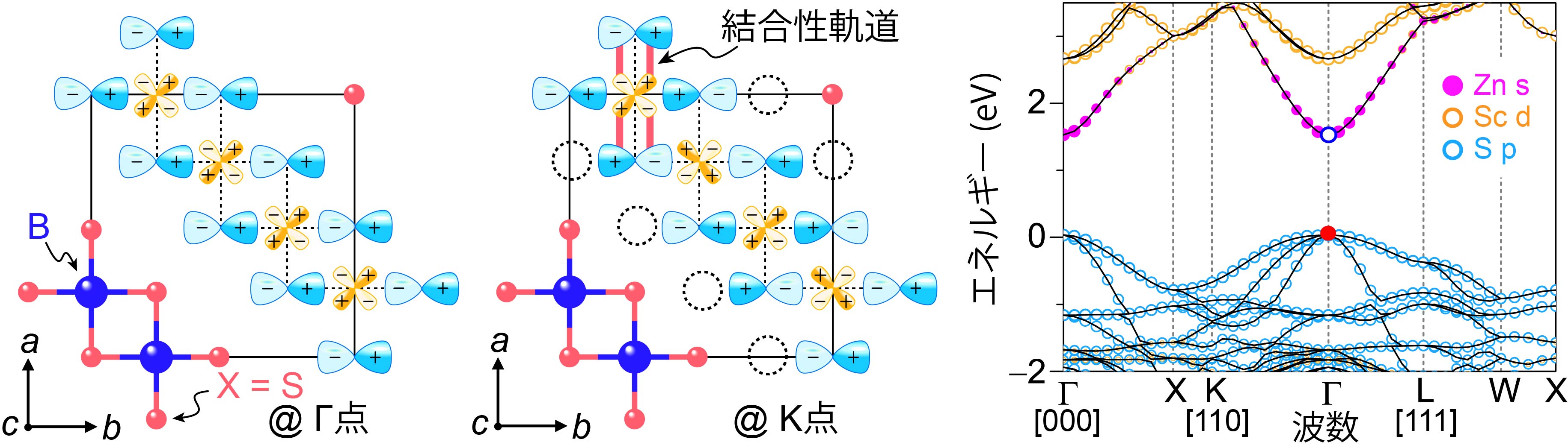 その探索指針は、立方晶スピネル型構造AB2X4におけるBサイトにd0電子配置を持つ遷移金属元素、Xサイトに硫黄やセレンなどのカルコゲンを選択するというシンプルなものです(下図)。スピネル型構造を有する化合物としては、酸化物が圧倒的に多く知られていますが、この指針に従ってカルコゲナイドのスピネル化合物を選択することで、バンド構造は直接遷移型になり、かつ伝導帯が深く、価電子帯が浅い電子構造が実現できることから、電子・正孔ともにドーピングがしやすくなります。