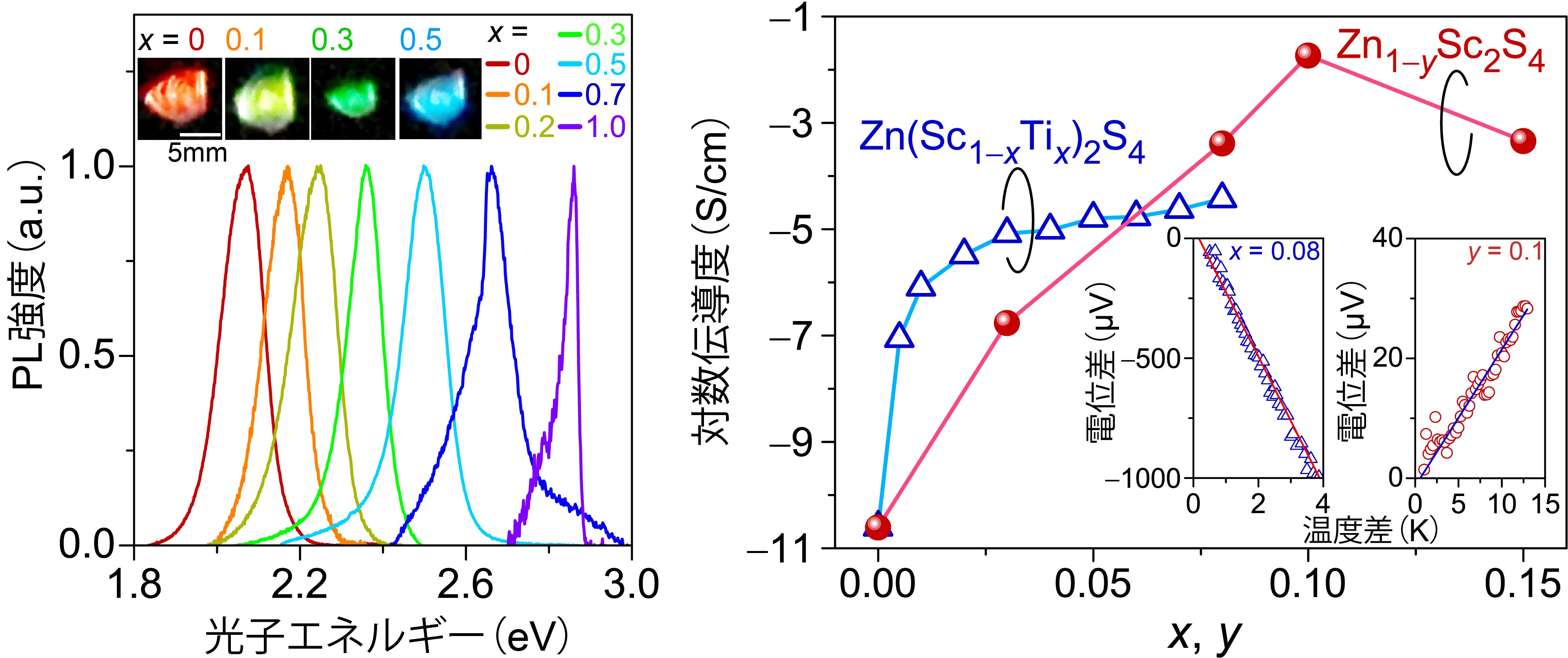 そして、有望な候補物質として、スピネル型硫化物(Zn,Mg)Sc2S4を選択し、固相反応法によって合成することで、室温で紫~橙色の広範囲で光り、p型にもn型にもドーピング可能な高い機能性を有することを実験的に実証することに成功しました(下図)。